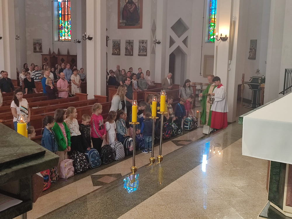 W niedzielę 4 września, podczas Eucharystii zgromadziliśmy się z trzech powodów, pierwszym z nich jest oczywiście niedzielny obowiązek uczestnictwa we Mszy Świętej, drugim początek roku szkolnego i obrzęd pobłogosławienia tornistrów i przyborów szkolnych, a trzecim rozpoczęcie Roku Formacji Ministranckiej. Podczas kazania ks. Dawid wskazał dzieciom, że obowiązki, które wypełniają codziennie, mogą doprowadzić ich do świętości, ale należy zawsze pamiętać o Panu Bogu.